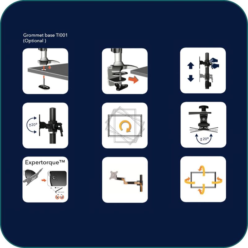 Aavara TI210 is a Single LED/LCD Monitor grommet base stand, featuring a wide angle of +/- 20 degree Tilt, +/- 20 degree swivel and a 360 degree rotation. It supports VESA 100x100/75x75mm display and ExperTorque™ technology enables adjustment of the screens hinged by its weight. Pole Height adjustment up to 355 mm /13.19''