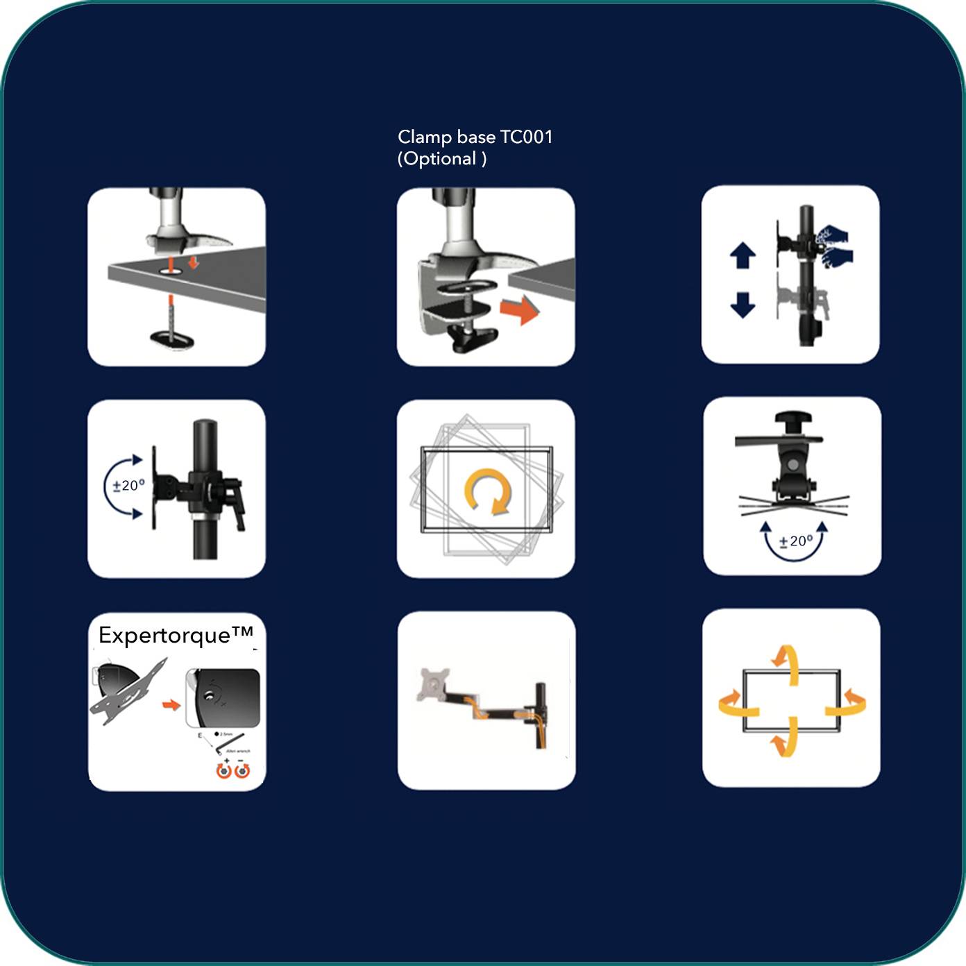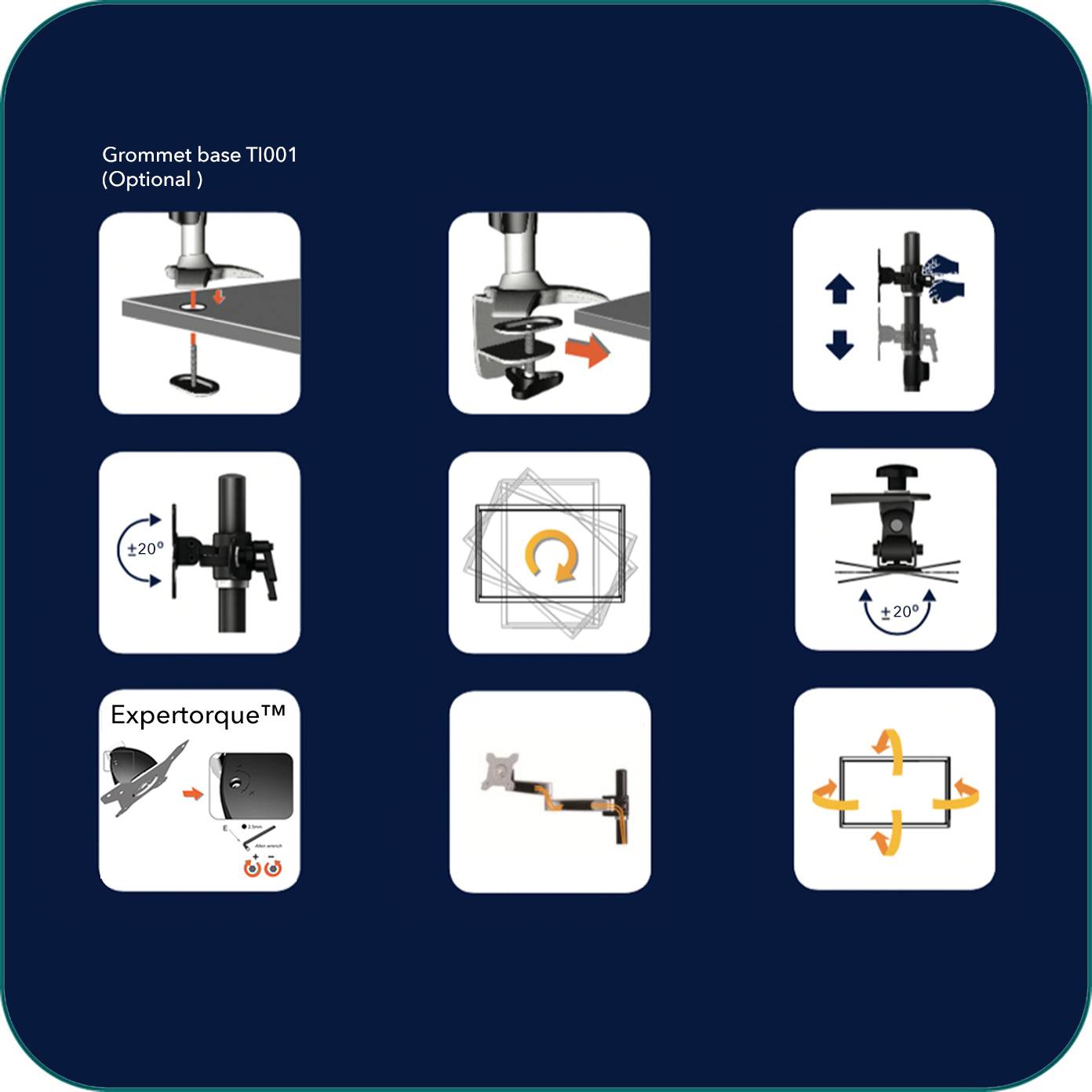 • ExperTorque™ design for easy adjustment hinged by monitor weight