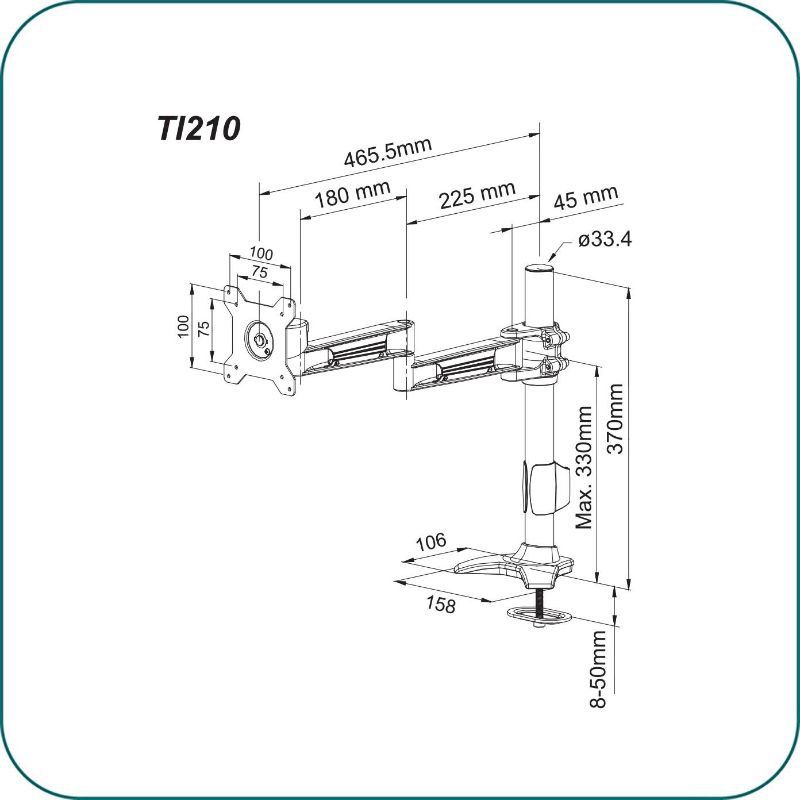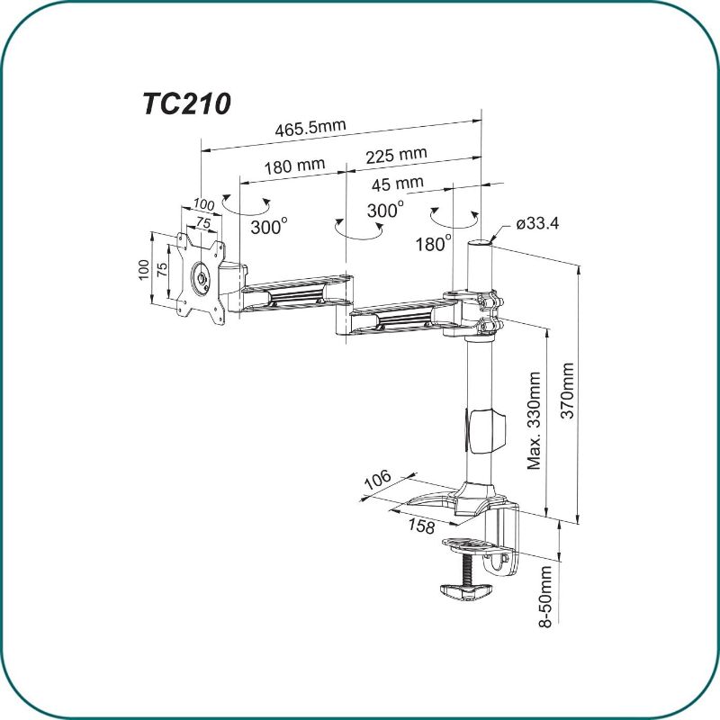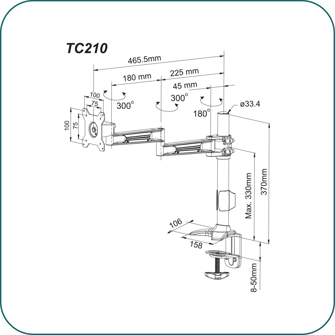 Aavara TC210 is a Single LED/LCD Monitor clamp base stand, featuring a wide angle of +/- 20 degree Tilt, +/- 20 degree swivel and a 360 degree rotation. It supports VESA 100x100/75x75mm display and ExperTorque™ technology enables adjustment of the screens hinged by its weight. Pole Height adjustment up to 355 mm /13.19''